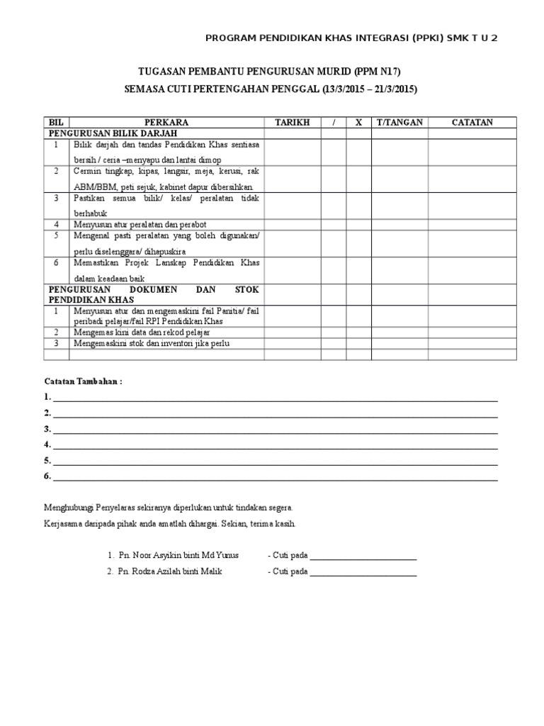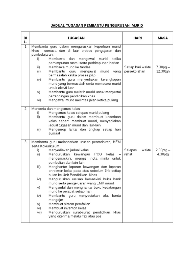 Isu Bidang Tugas Pembantu Pengurusan Murid Pendidikan Khas Pdf Document from reader015.fdokumen.site (b) membantu menimbulkan suasana yang selesa, selamat dan menggembirakan bagi meransang bimbingan dan asuhan. Pegawai hendaklah menyenaraikan tugas harian dengan menggunakan borang yang disediakan. Fail meja pembantu pengurusan murid asrama? Contoh surat tugas pengurusan barang ekspor. membantu mengawasi murid semasa rehat. 21.0 senarai tugas harian pembantu pengurusan murid. Temuduga pembantu pengurusan murid (ppm) n19: 4.3 menjaga murid yang sakit sementara menunggu kedatangan ibu bapa/penjaga.