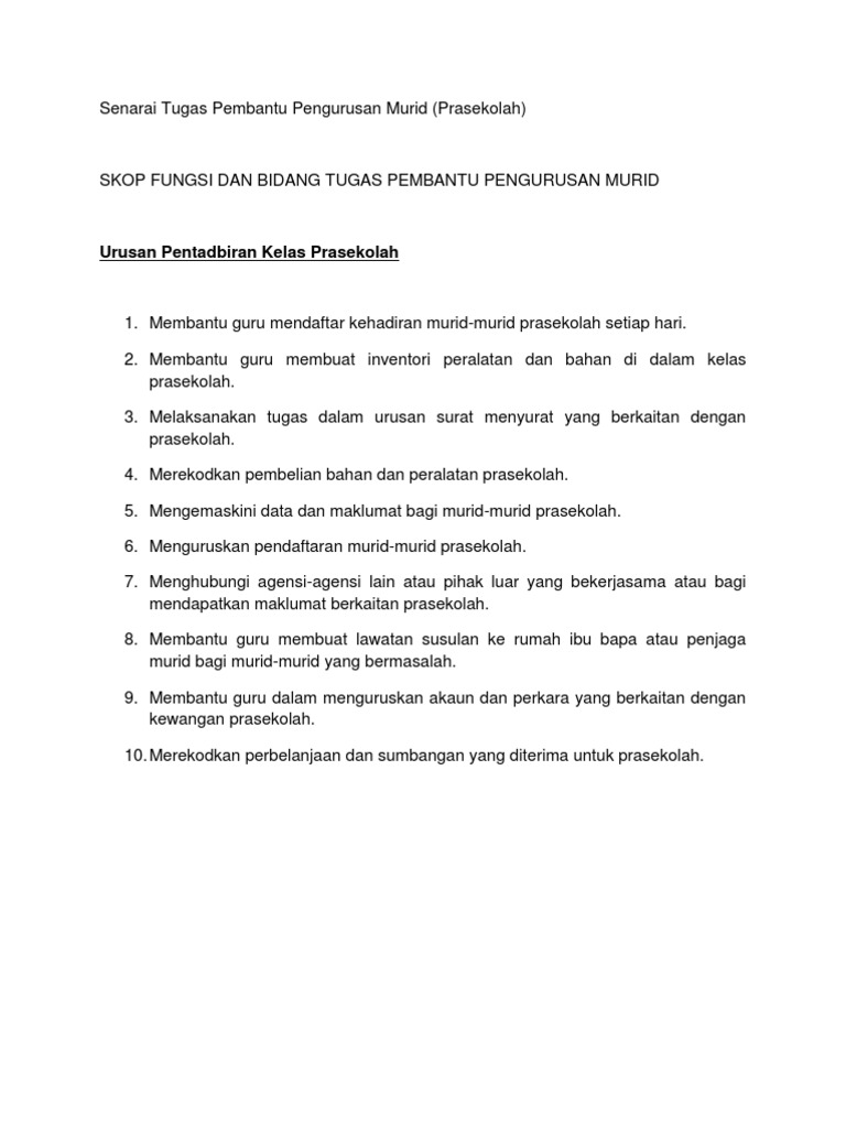 Senarai Tugas Pembantu Pengurusan Murid Prasekolah Kpm Cute766 from i0.wp.com Contoh surat tugas pengurusan barang ekspor. Contoh surat tugas pengurusan dokumen. Memastikan pelaksanaan program pendidikan prasekolah. Berupaya membantu murid membaca, mengira, menulis dan melukis. Jawatan pembantu pengurusan murid dilantik menjadi penjawat awam kerajaan pada tahun 2005. Berkeyakinan dan komited dalam melaksanakan tugas yang diamanahkan. 21.0 senarai tugas harian pembantu pengurusan murid. Calon hendaklah warganegara malaysia berusia tidak kurang daripada 19 tahun pada tarikh tutup permohonan iaitu 03 jan 2019.